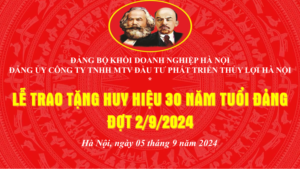 Sáng ngày 05/9/2024, tại trụ sở Công ty TNHH Một thành viên Đầu tư phát triển Thủy lợi Hà Nội long trọng tổ chức Lễ trao tặng Huy hiệu 30 năm tuổi Đảng đợt 02/9/2024 cho đảng viên Đinh Văn Tuấn - Uỷ viên Ban Thường Vụ Đảng ủy, Trưởng phòng Tổ chức - Hành chính Công ty.
